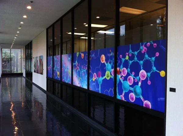 As a Junior Designer I worked on a team to integrate elements from various brands into interior graphics for offices. The three molecular compound art pieces were created to accurately display the compounds of the research facilities flagship developments. A point of personal pride was that the scientists working in this facility were very excited to see their compounds displayed so beautifully and accurately.